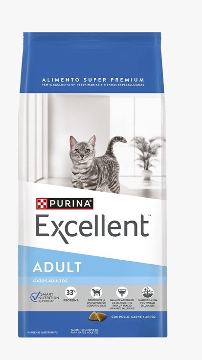 PURINA Excellent Adulto Pollo y Arroz, ofrece una fórmula con una óptima combinación de ingredientes, proteínas de alta digestibilidad y ácidos grasos omega 3 y 6, para mantener al máximo la salud del gato adulto.